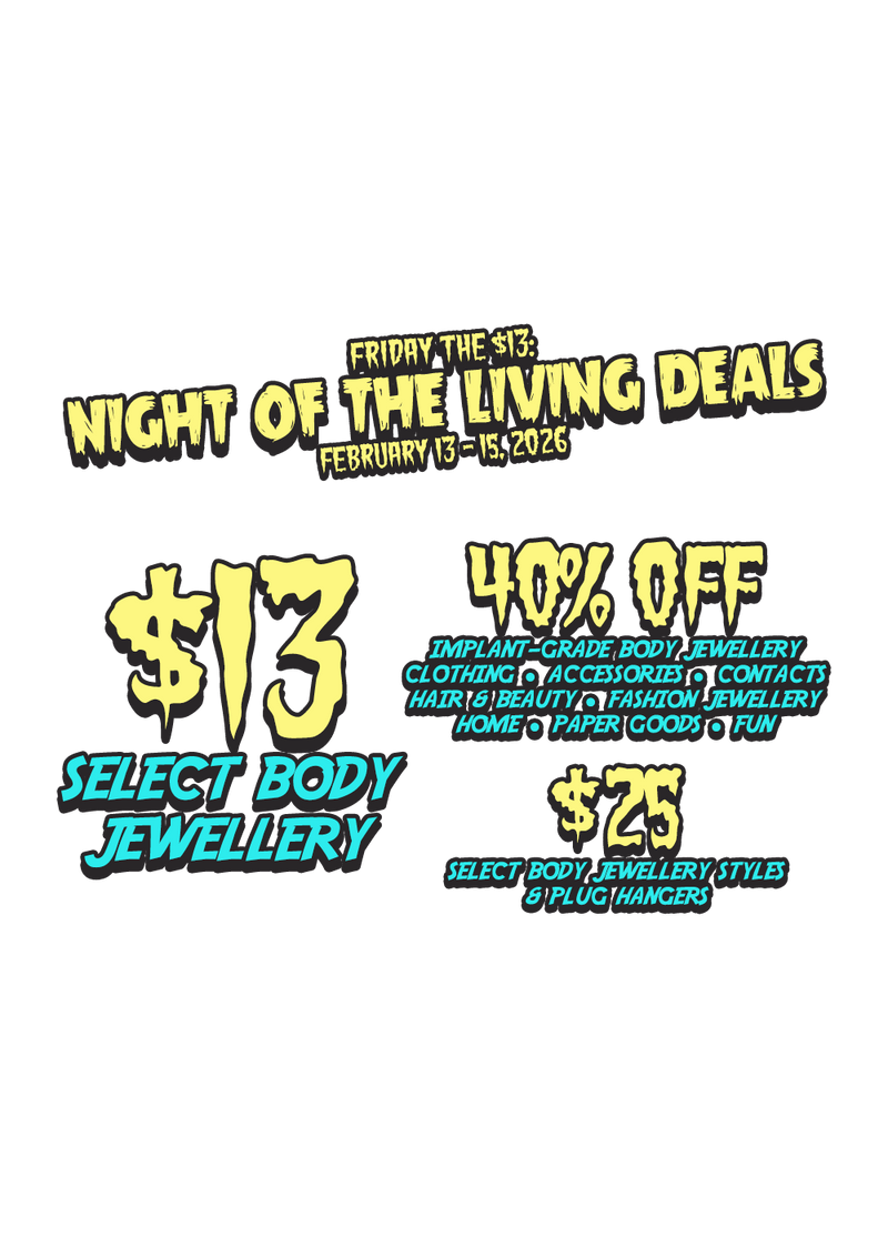 Promotion:$13 Select Culture Craze Brand body jewellery originally priced $40 and under; $25 Select Culture Craze Brand body jewellery originally priced $41 and over; $25 Plug Hangers; 40% Off Clothing, Accessories, Implant-Grade Body Jewellery, Hair & Beauty, Contacts, Fashion Jewellery, Home, Fun, and Paper Goods categories.