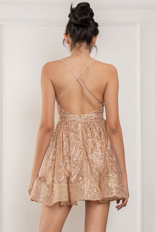 Glitter Mesh Deep V Neck Open Back Mini Dress