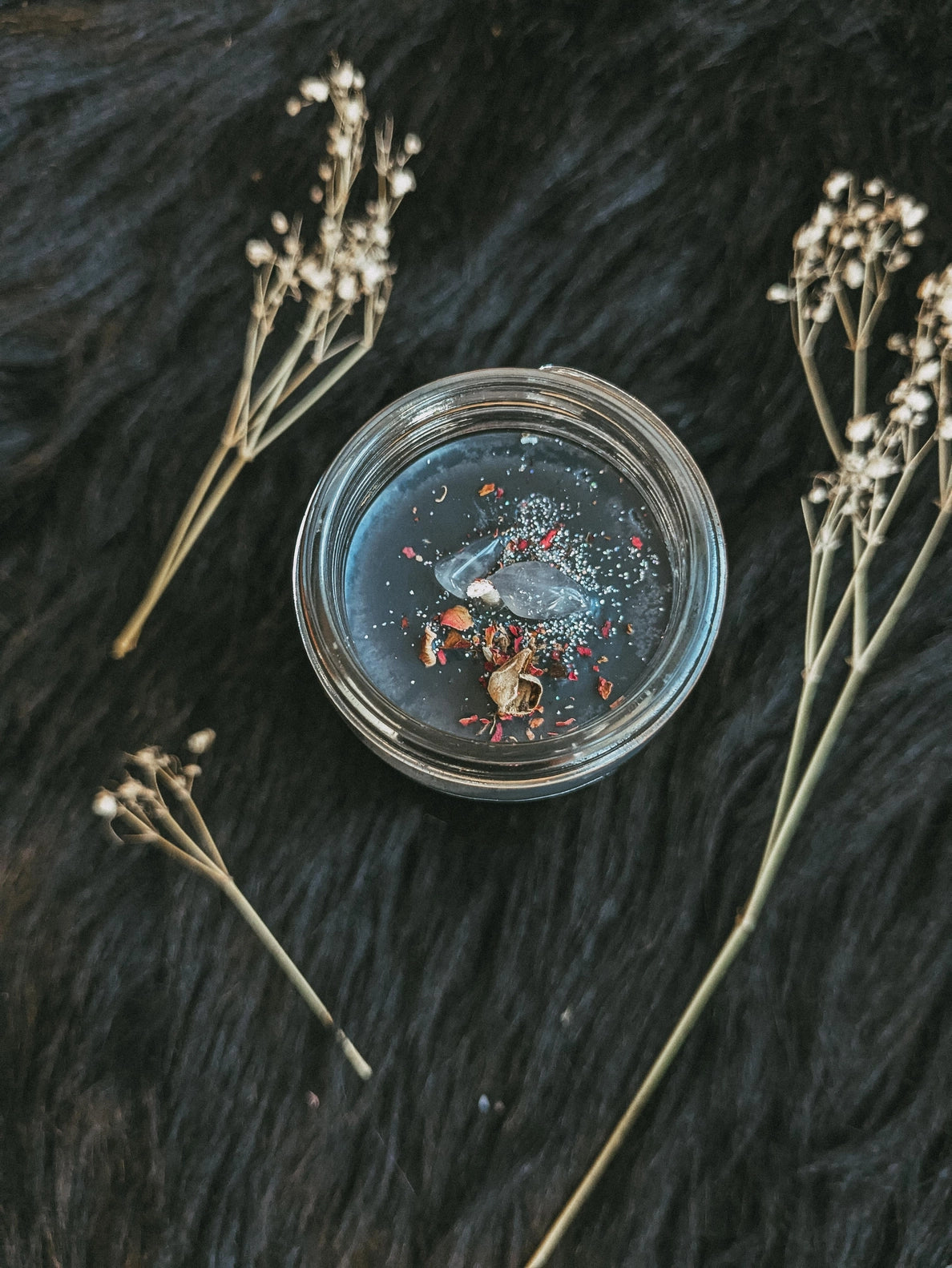 Ingredients: Natural Soy Wax, Cotton Wick, Paraben Free + Phalate Free Fragrance, Biodegradable Glitter, Crystals And Herbs
