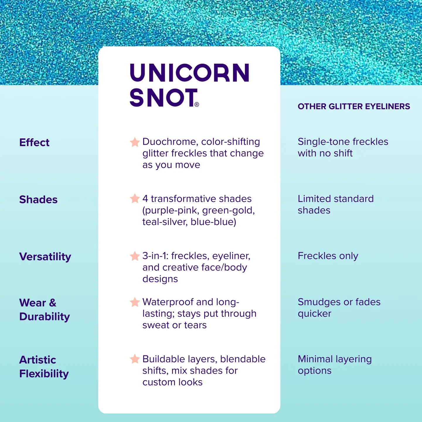 • Multiuse formula for glitter freckles, eyeliner, and body designs